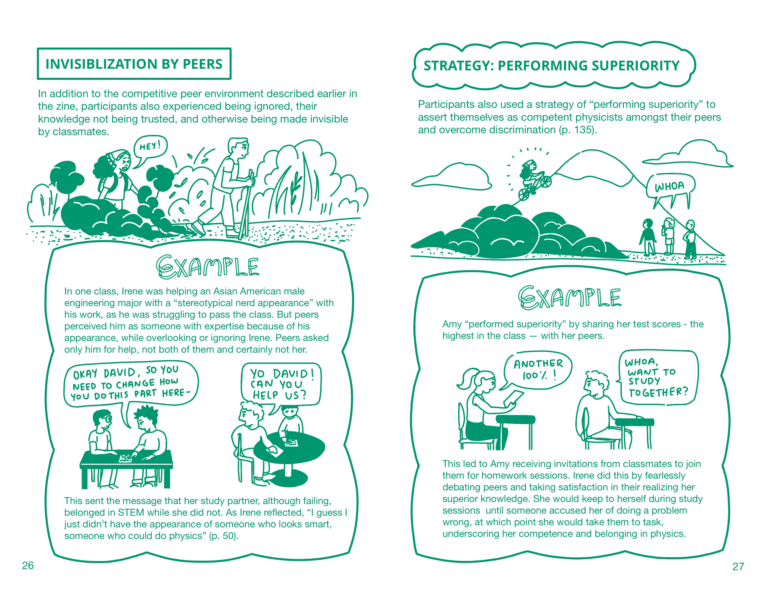 A Perilous Path Through Physics is a 60-page zine about the structural and interpersonal marginalization that women of color physicists experience in their schooling and careers, as well as the community, family, and individual support, strategies, resources, and resilience that they access to survive and, in some cases, thrive. This zine is based on the book “The Double Bind in Physics Education: Intersectionality, Equity, and Belonging for Women of Color” by Dr. Maria (Mia) Ong, and was commissioned by Dr. Ong with funding from TERC. The book provides insights from Dr. Ong’s 25-year longitudinal study following 10 women of color from their time as physics undergraduates through their varied career and life paths leading to now. The zine takes these learnings and places them as visuals of obstacles and helping hands along a difficult journey.